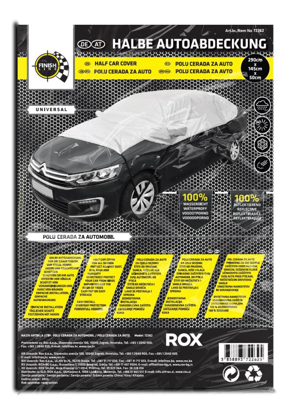 Prav tako ščiti pred toplotno obremenjitvijo, saj bo pokrilo streho, sprednjo steklo in stranski stekli. Pokrivala ima sistem za pritrditev s 4 točkami za varno namestitev na odbijač avtomobila. Je zelo enostavno za uporabo ter shranjevanje, priložena pa je tudi vodooprorna vreča.